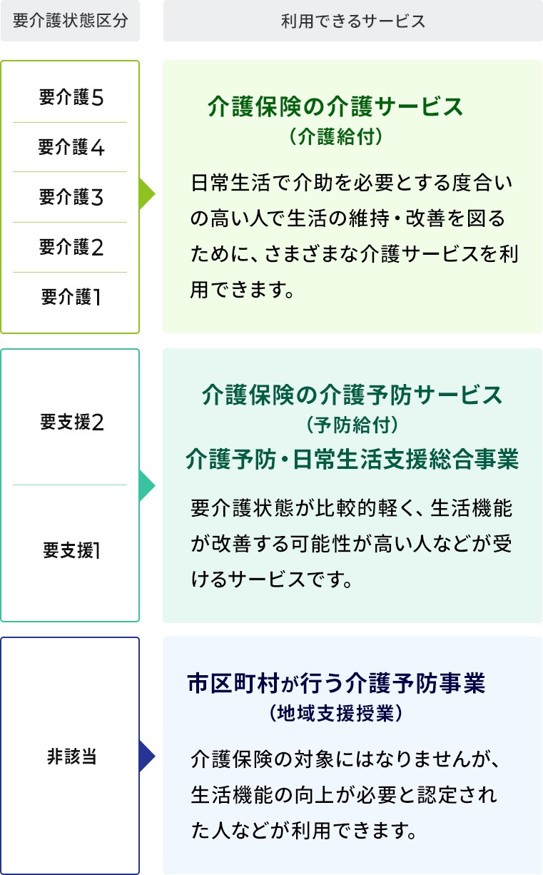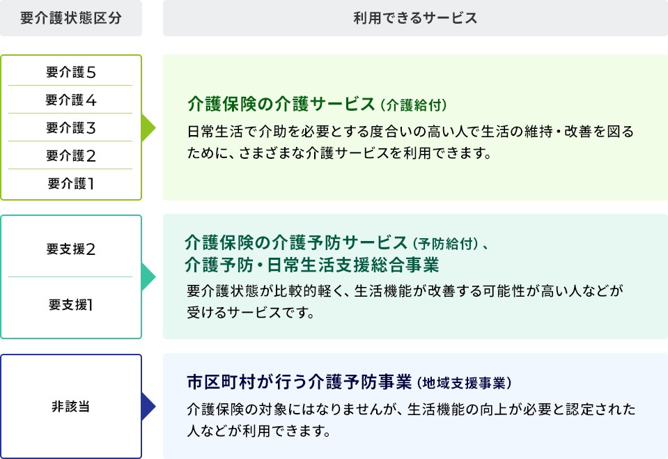 介護保険サービスを利用できるのは、介護保険料を支払い、以下の条件で、居住する市区町村に要支援・要介護状態であると認定を受けた方です。