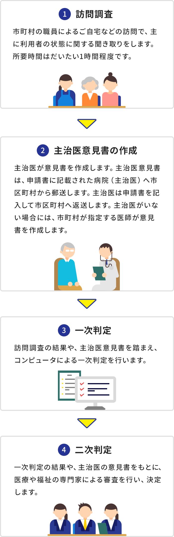 申請をした後、下記のような訪問調査や審査・判定の手順を踏んで、どの程度の介護や支援が必要なのかの目安となる「要介護度」が決まります。