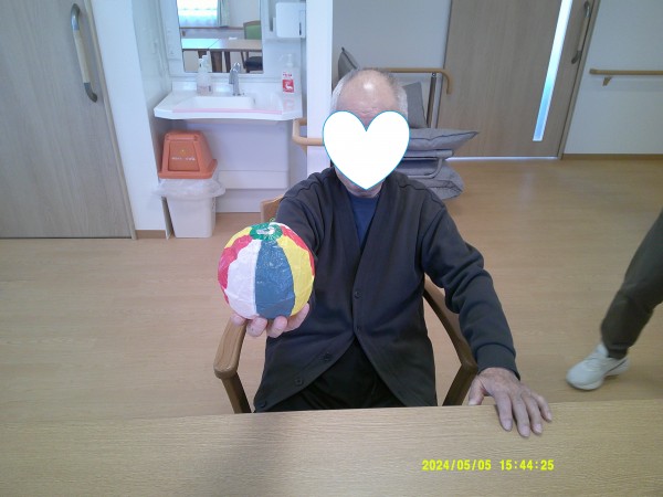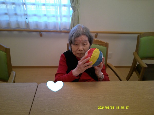 入居者様皆様で紙風船バレーボールを行いました。(^_-)-☆