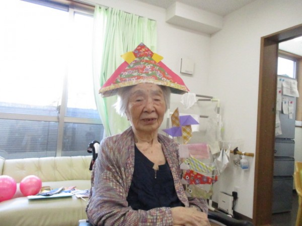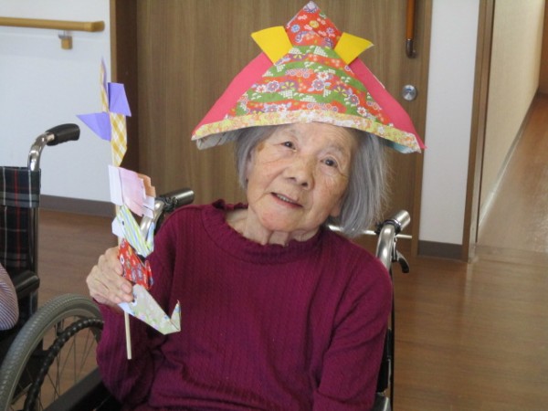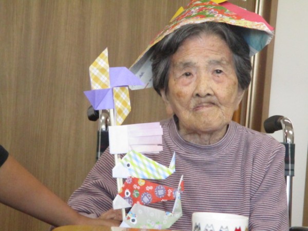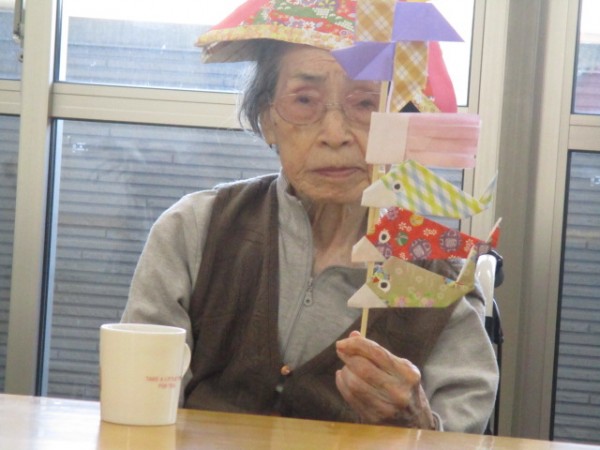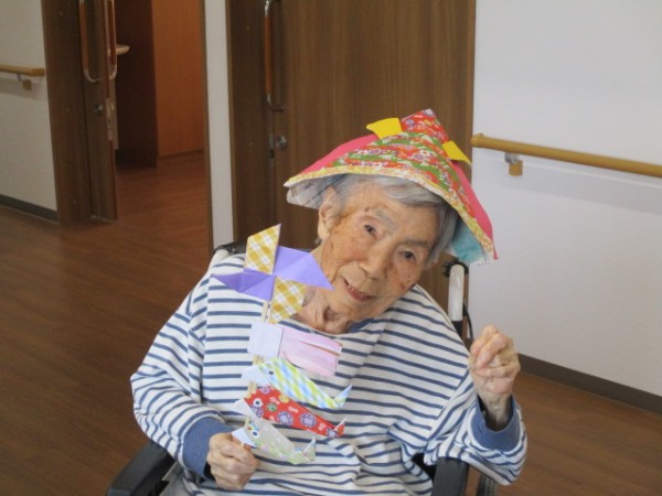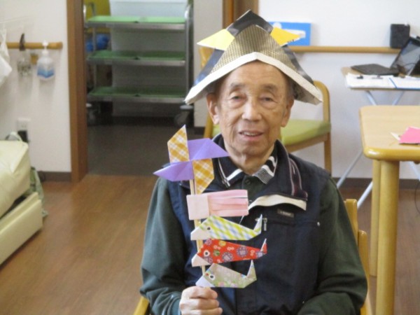 兜を被り手に手作り鯉のぼりを持って写真撮影しました。 笑顔の人や(*^。^*) あれどうしたのかしら?