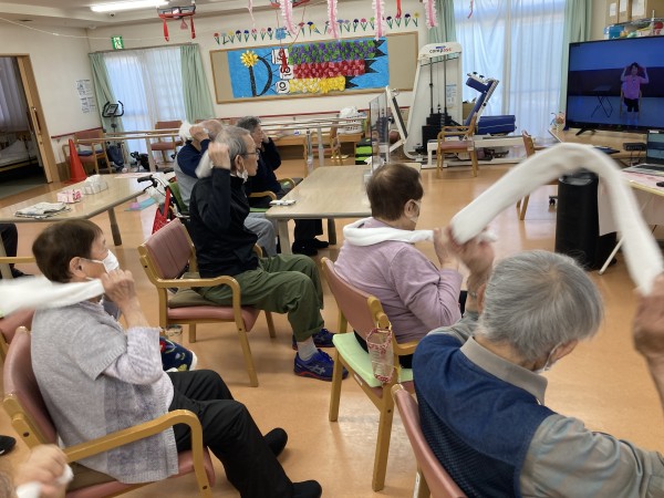 タオル体操は身体を解したり、筋肉を伸ばしたりして多くの刺激を与えていく、人気運動教室の一つとなります(*^^)v