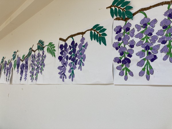 ★☆初夏の花「藤の花」貼り絵飾り付けレクリエーション2024年✨ 『みんなの家 三橋6丁目 介護ブログ』☆★