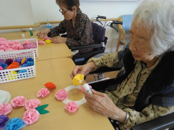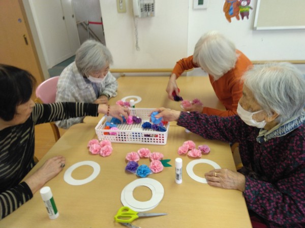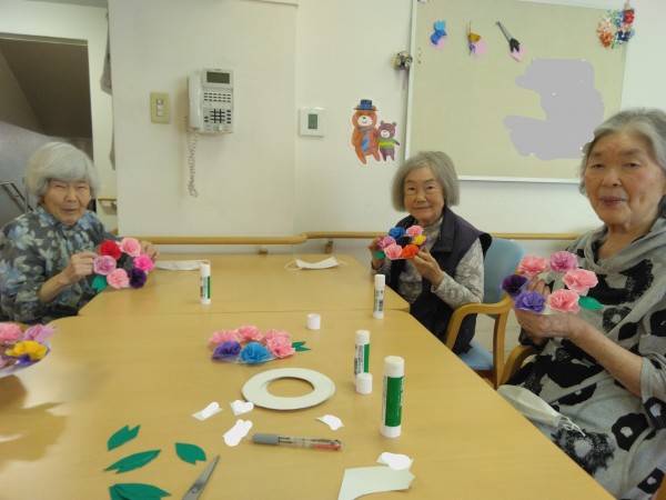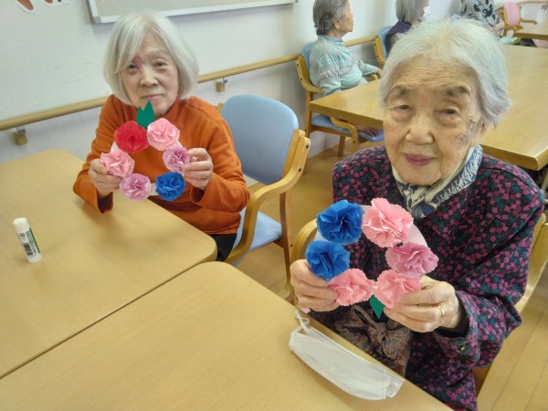 皆様たくさん悩んで完成したカーネーションリースに「この色綺麗ねー」「作れて嬉しい」「早く部屋に飾りたいわ」と大満足で笑顔がいただけた創作レクリエーションの時間でした♪