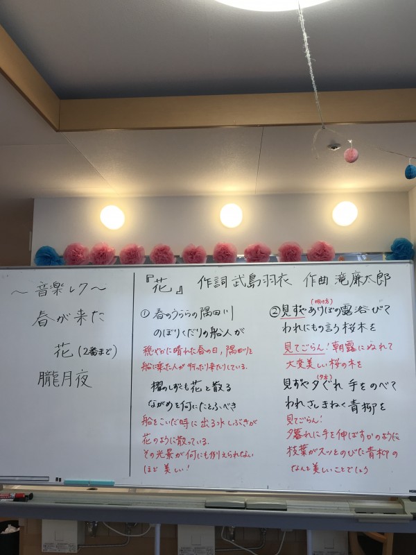 この中から、特に「花」をピックアップして、作曲家の滝廉太郎についてや、「花」の歌詞について、少しお話させていただきました。
