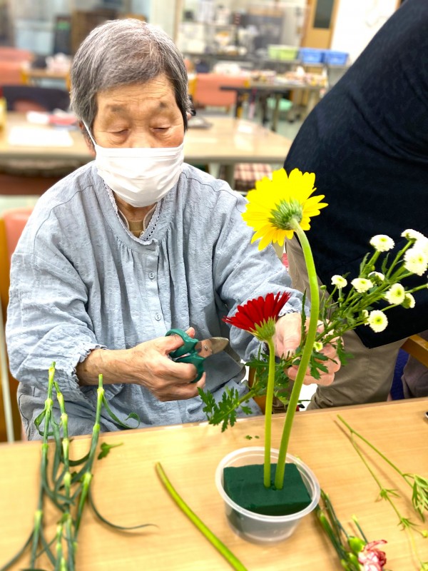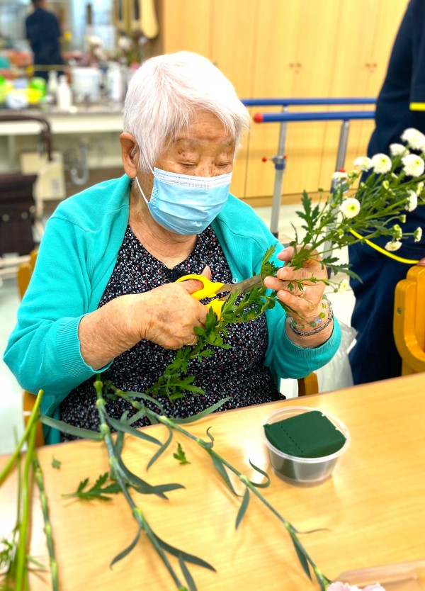 「お水を吸いやすいように長すぎない方が長持ちしますよ」という先生のお言葉を聞きつつも