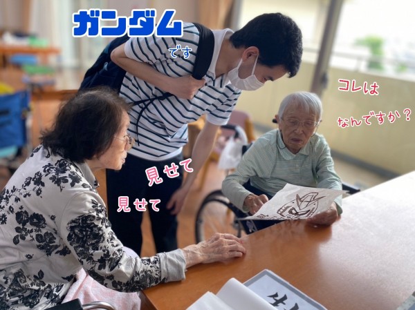 入居者様と一緒に書道かと思いきや、岡田くんの特技は絵画です!