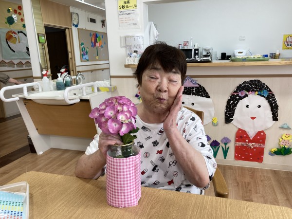 職員さんの差し入れのアジサイに喜ばれる利用者様♪どっちが可愛い?(笑)