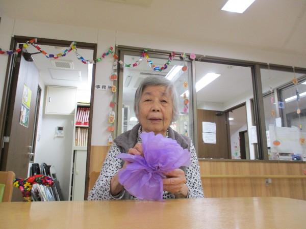 みんなと一緒に6月の紫陽花の壁飾りのお手伝いをしてもらいました。