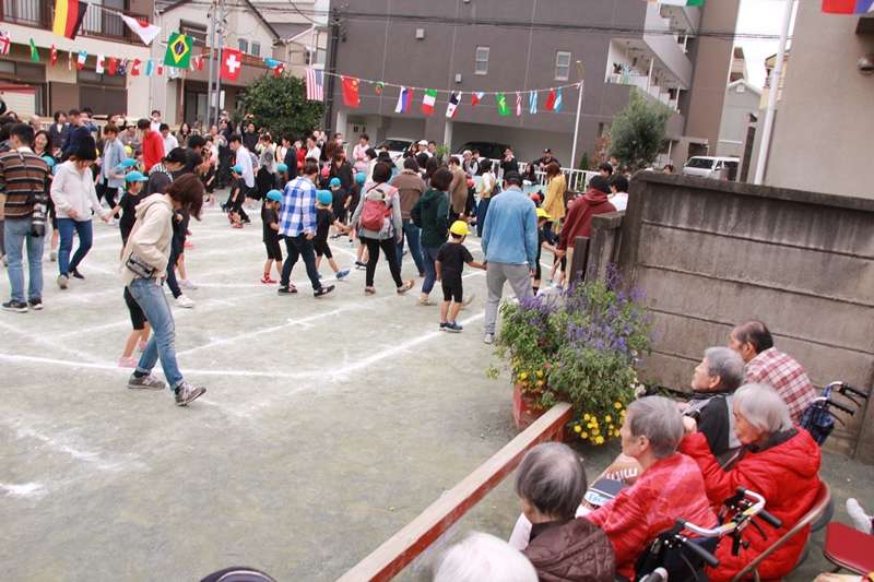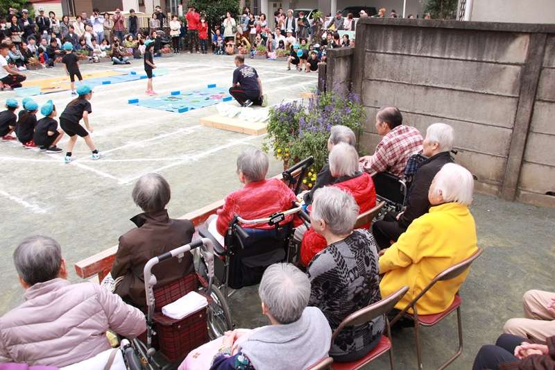 10月13日(土)くもり 今日は、いつも交流をさせていただいている、近所のきたしば保育園の運動会にご招待され、グループホームのご入居者様全員で、観戦に伺いました。朝から曇り空で、気温が低く、皆様の体調を考え伺うのを中止にとするかと思っておりましたが、ご入居者の皆様方が、子供たちの頑張りを見たいと言う事で寒さ対策の準備をしいざ出発!車いす4台、シルバーカー5台行は自立だ保育園まで歩かれ、観戦、可愛い子供たちの頑張りに、大きな拍手を送っていました。フォークダンスの時間があり、オクラホマ・ミキサーの曲が流れると脚でステップを踏まれている方、職員と一緒にダンスをする方楽しい1時間を過ごされました。帰りは、車いすが1台増え5台の車いすで帰居されました。