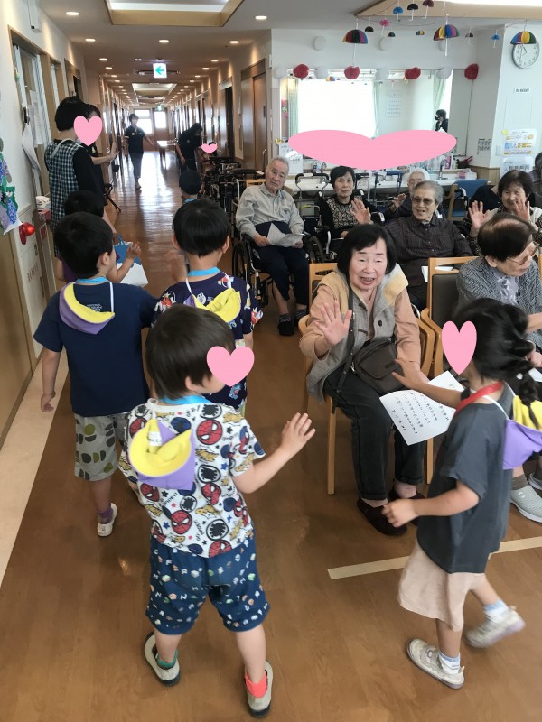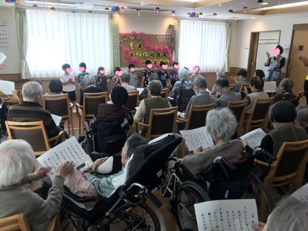 幼稚園のみんなと入居者様・職員一同で歌を歌ったり、幼稚園の皆に施設での生活等のお話や逆に幼稚園の様子を話して頂いたり、