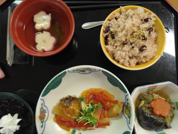 お誕生日メニューはお赤飯・すまし汁・揚げあじの甘酢あんかけ・茄子の煮浸し・巨峰ゼリーと豪華な昼食を召し上がっていただきました!