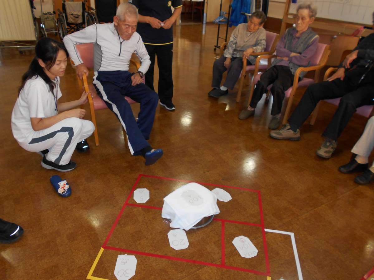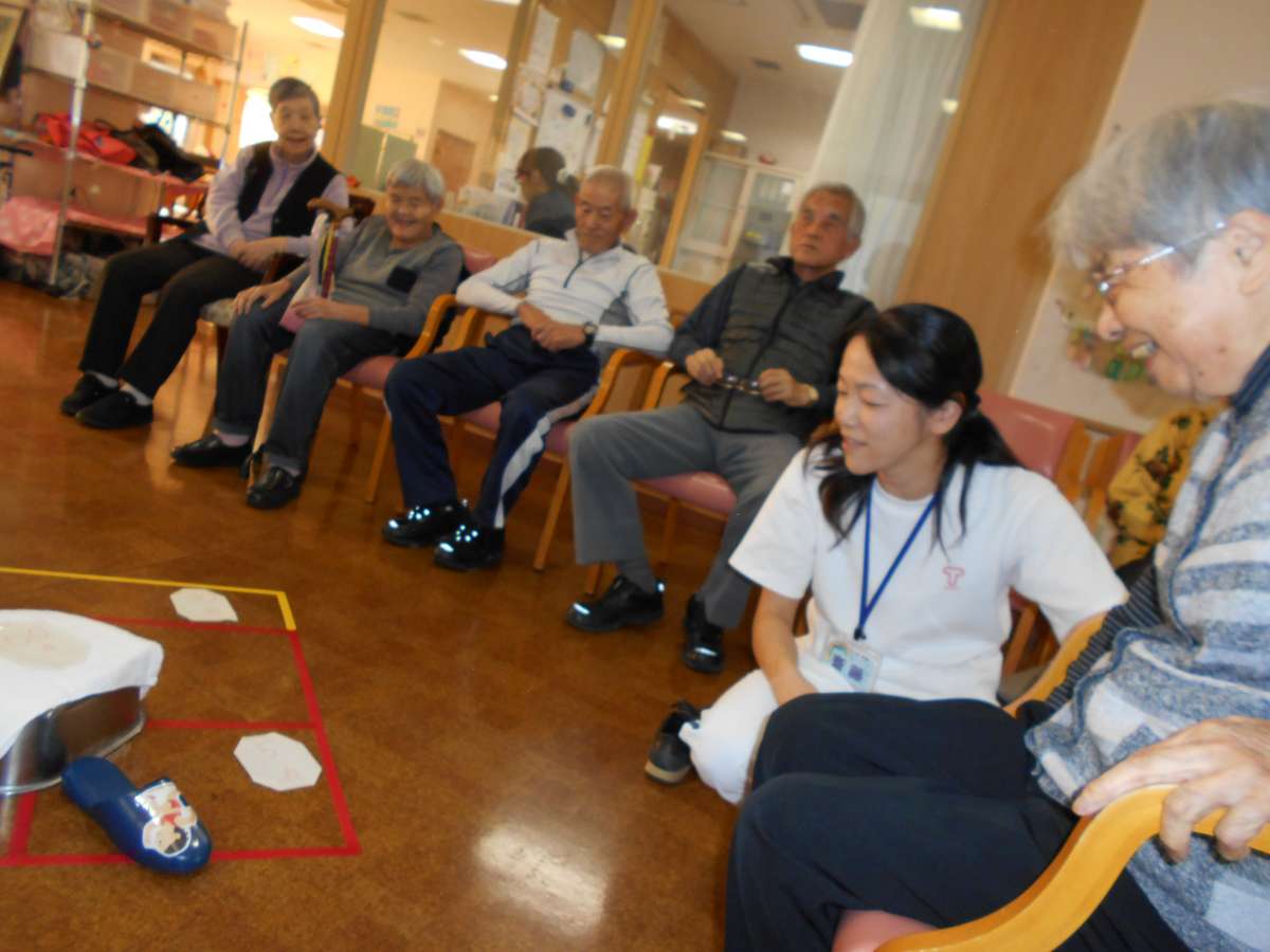 スリッパ飛ばしで得点を競うゲームを行いました。