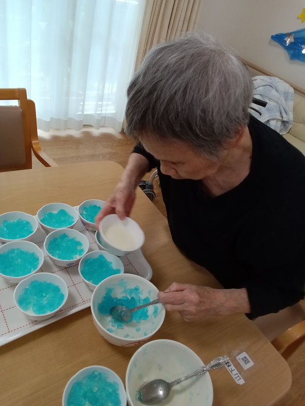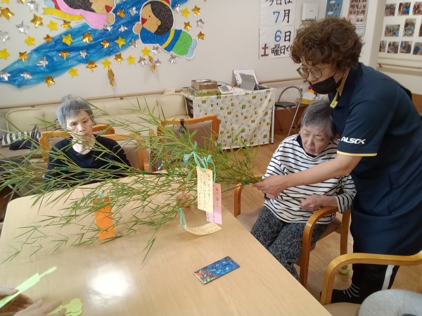 みんなで一緒に、七夕祭りを行いました。笹に願い事を書いてつるしました。皆さんどんな願い事を書いたのでしょうね。