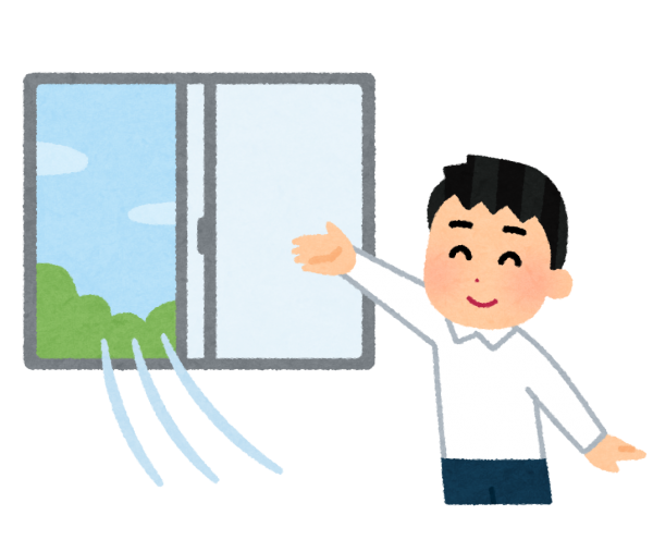 窓2つもしくは窓とドアの2ケ所を開ける。