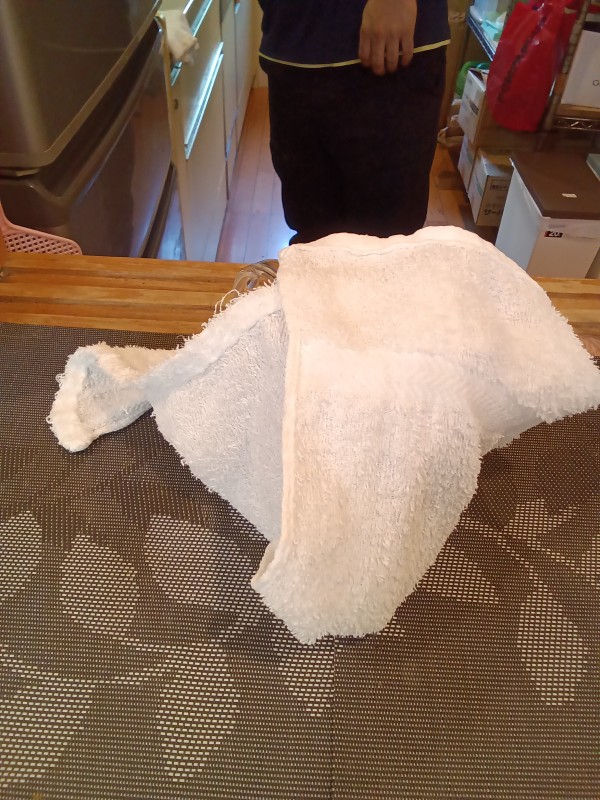 あとは布でくるんで保温し、2~3分待つだけ。