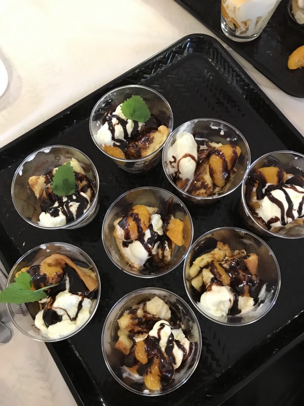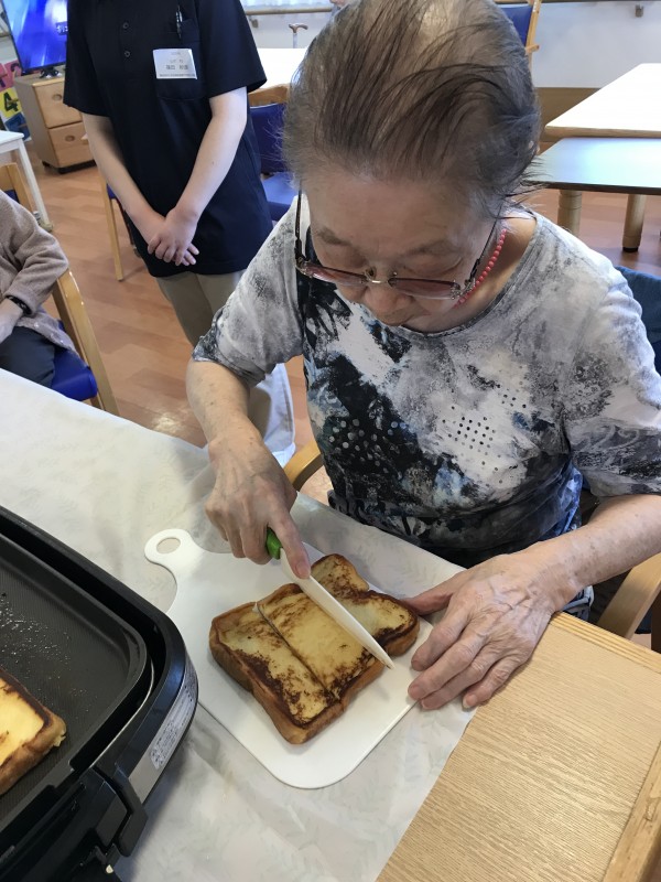 出来上がったフレンチトーストを一口サイズに切り、トッピングしていきます(^^♪