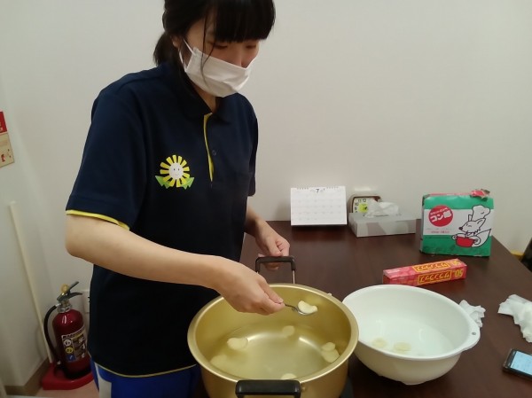 看護師さんや職員さんに試食してもらったところ、白玉粉に対してお豆腐が2.5倍の方がよさそうでした。