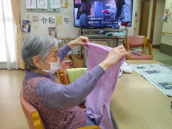 日中はフロアで皆様思い思いに生活されています。洗濯物たたみや新聞折りを手伝って頂くこともあります。