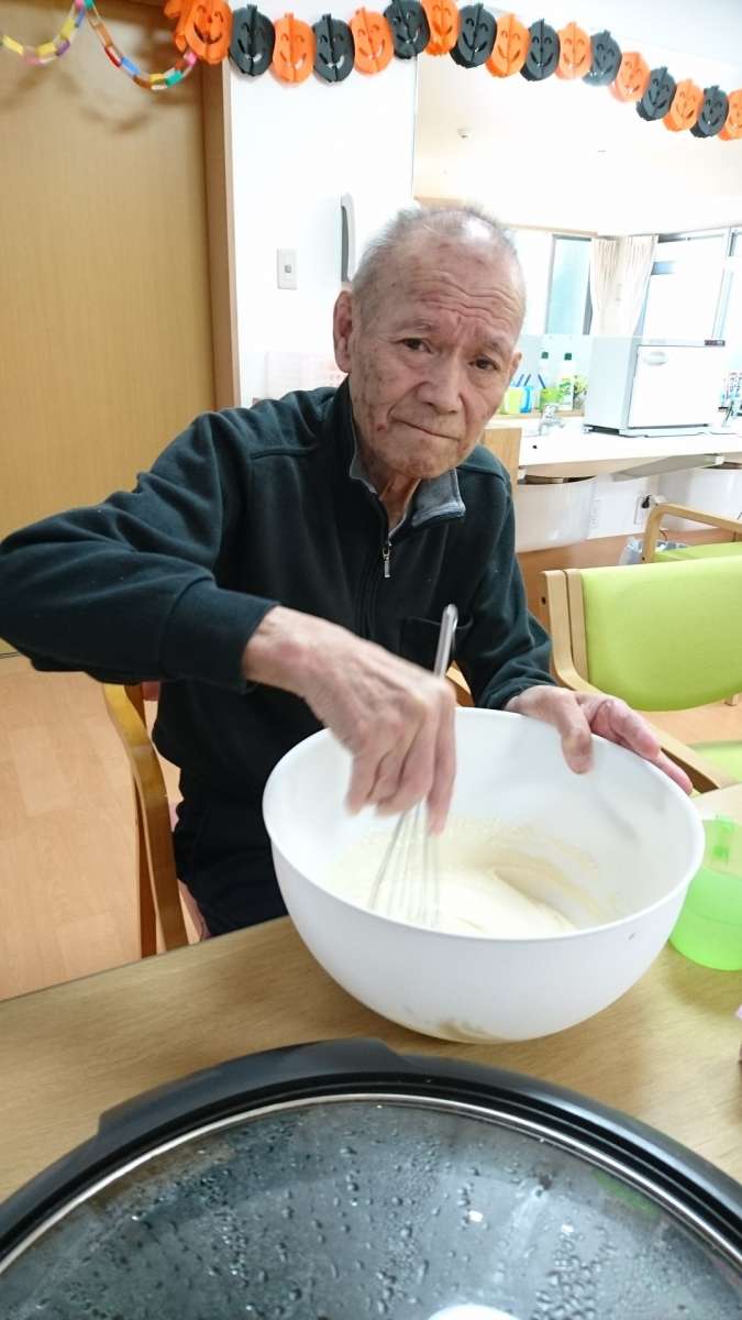 利用者様に種を混ぜるのを手伝ってもらい、とてもおいしそうなケーキが出来上がりました。