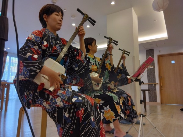 皆さまが一緒に歌えるソーラン節、花笠音頭など三味線にて演奏してくださり一緒に歌いました