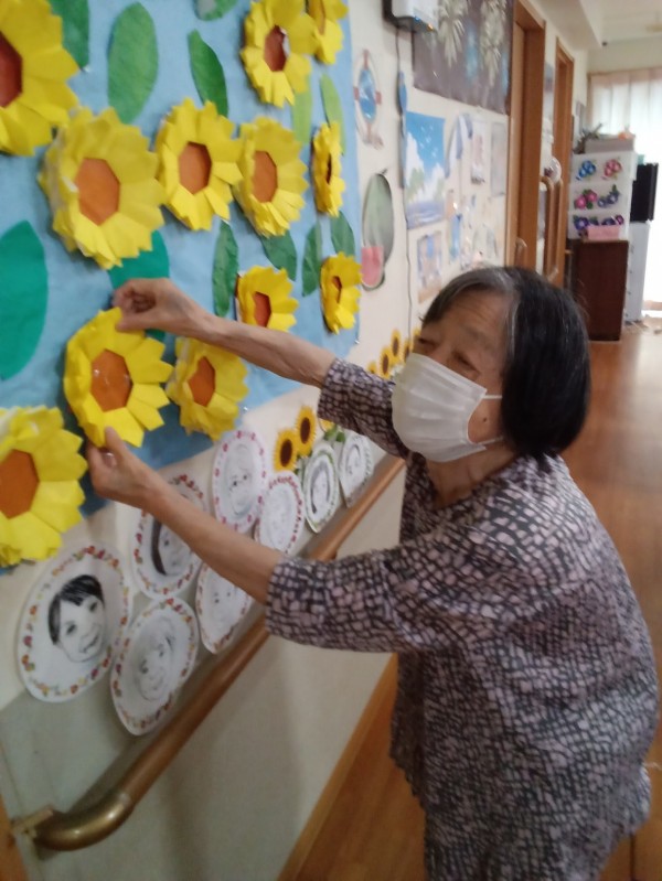 「それはねぇ~ここ ココ」と手作りひまわりを手に取り