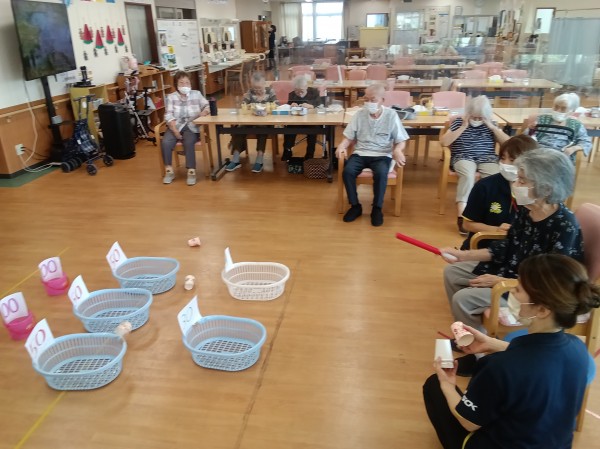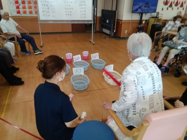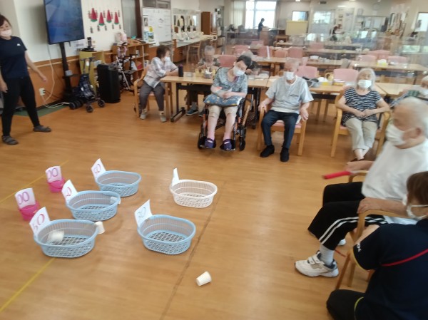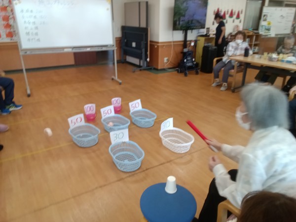 紙コップを放り投げて、かごの中に入れて点数を競うゲームです。