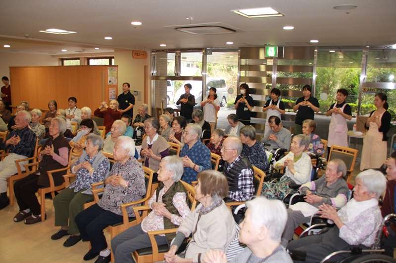 10月23日(火)2か月ぶりの、あんしんヨガ教室いつもは、すこや家西東京の3階・5階のフロアーで行っていますが、今回はデイサービスのご利用者様から、ショートステイ、グループホーム、特定すこや家西東京のご入居者の方々と職員が、1階玄関ホールにて約60名の参加およそ1時間、呼吸を整え先生の教えに従ってヨガの世界に浸っていました。