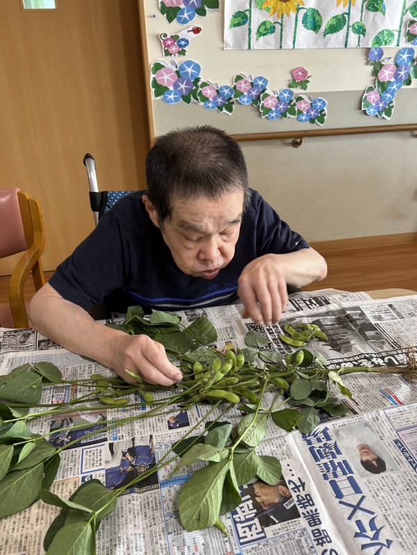 今回は、素敵な枝豆をご家族様より頂いたのでみんなで協力して枝豆をとりました✨
