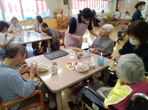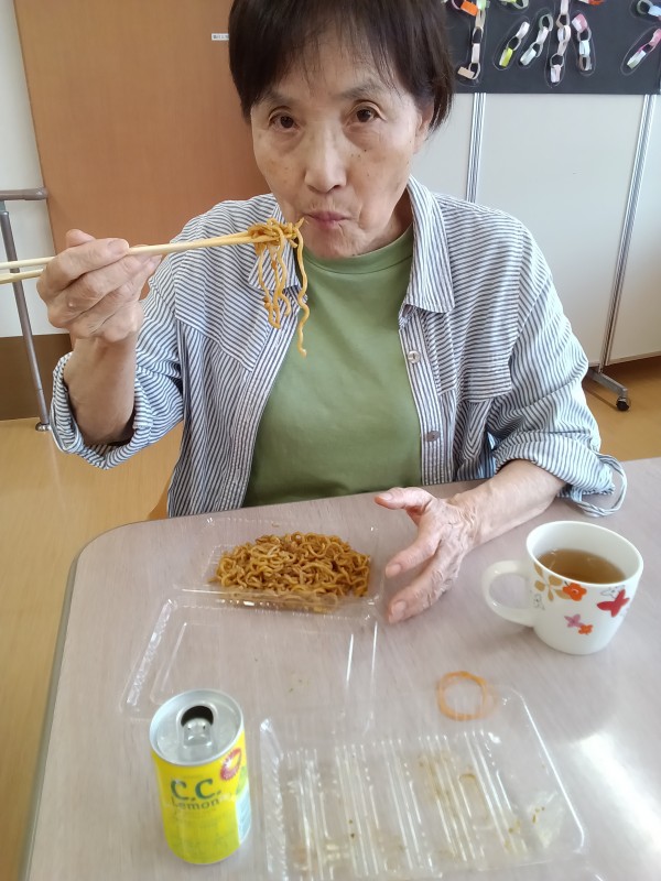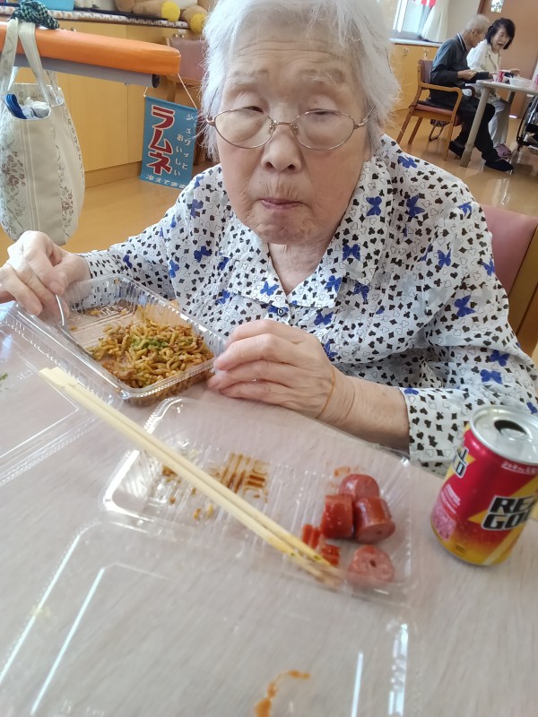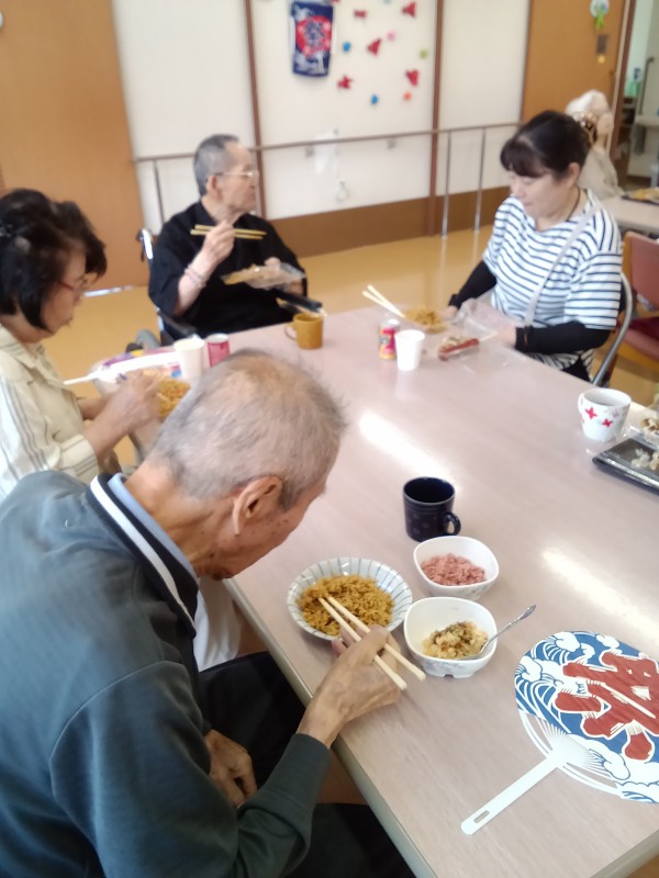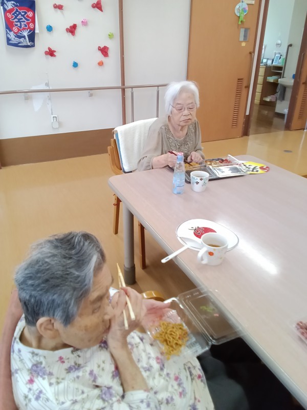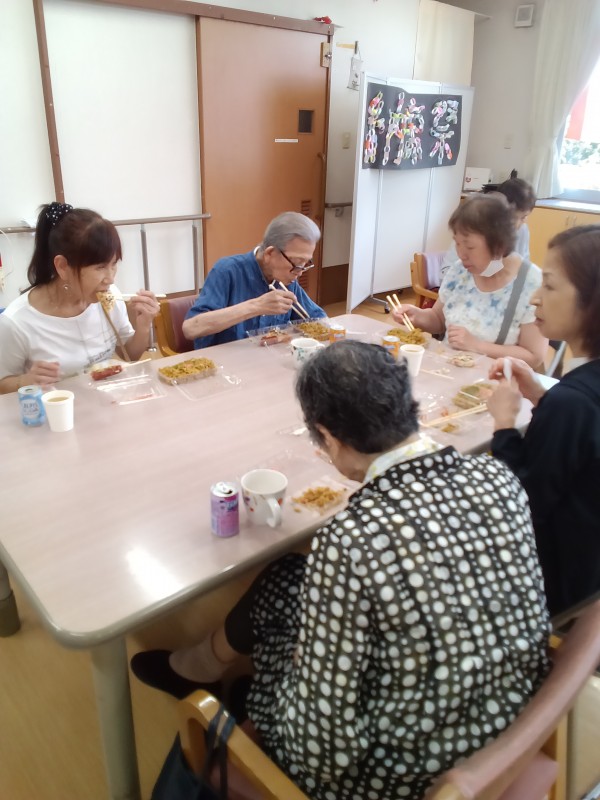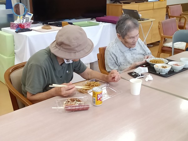 ご家族様とご一緒に夏祭り気分を味わっていただきたく屋台をイメージしたスタッフ奮闘の手作りのメニューで焼きそば、お好み焼き、フランクフルト、ジュースを召し上がって頂きました。