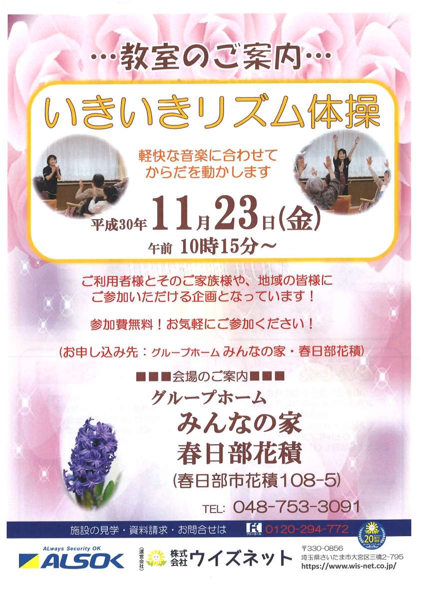 ◎グルームホーム みんなの家・春日部花積で、11月23日 10:15~10:45に ”いきいきリズム体操教室”を開催致します。どなたでもご自由に参加できます。お気軽にお越しください。