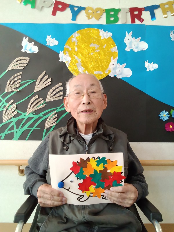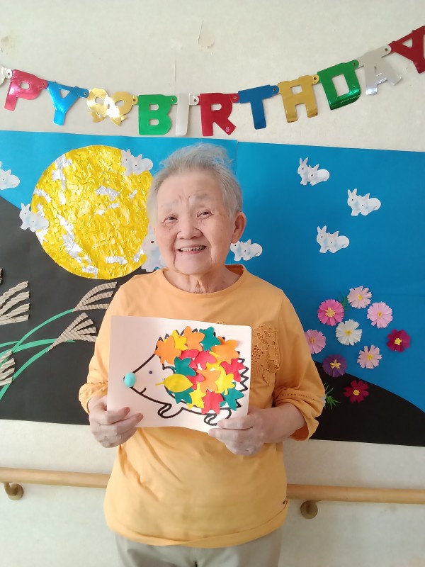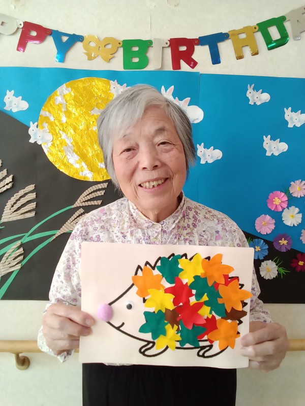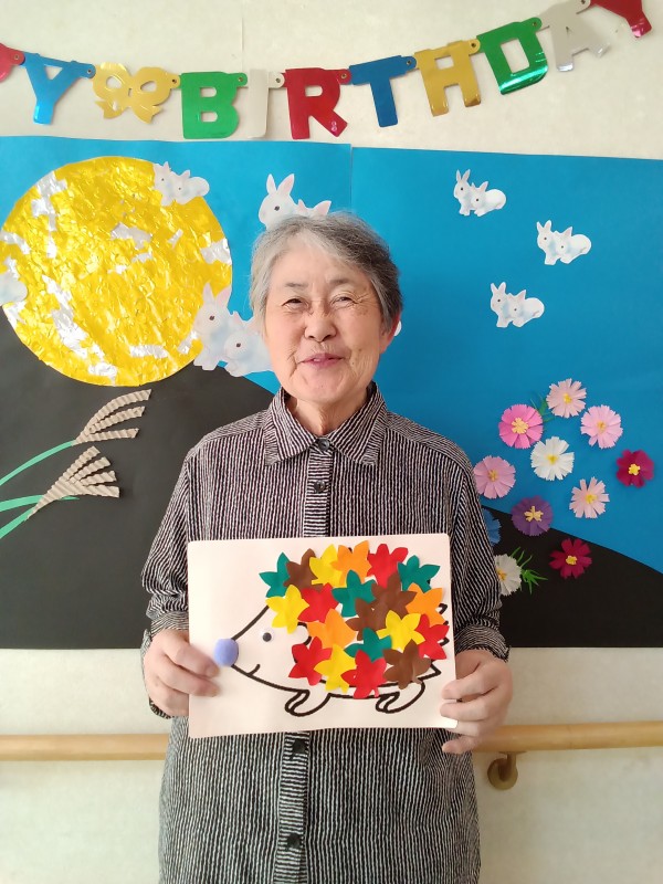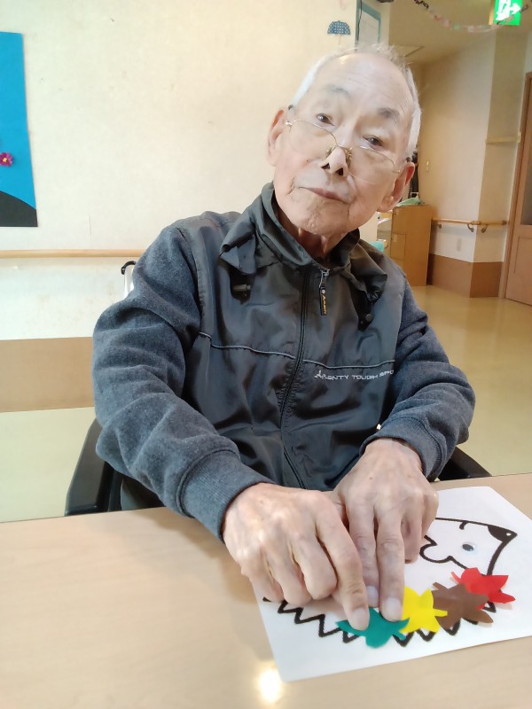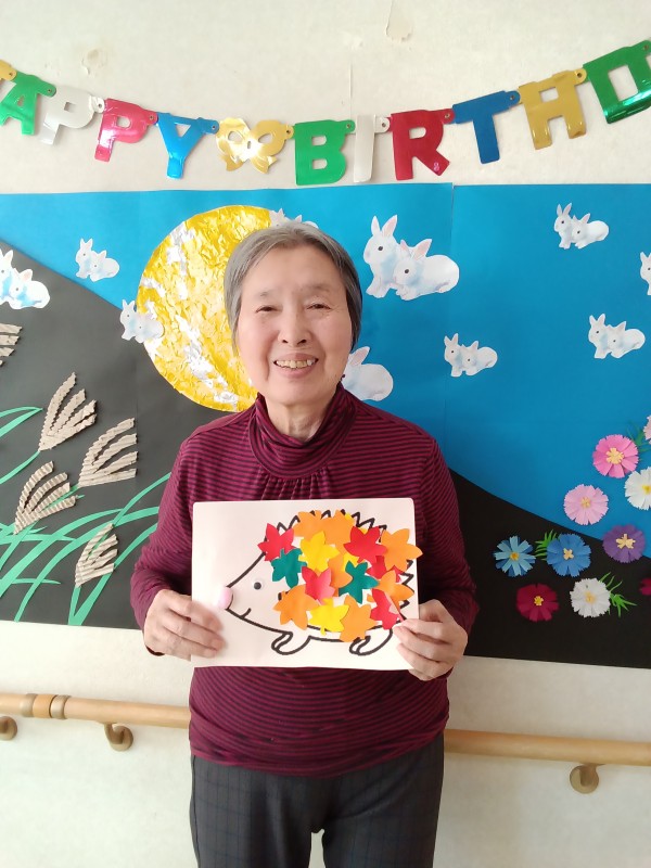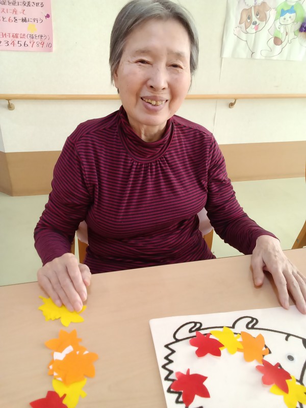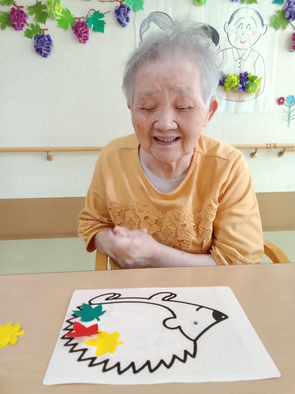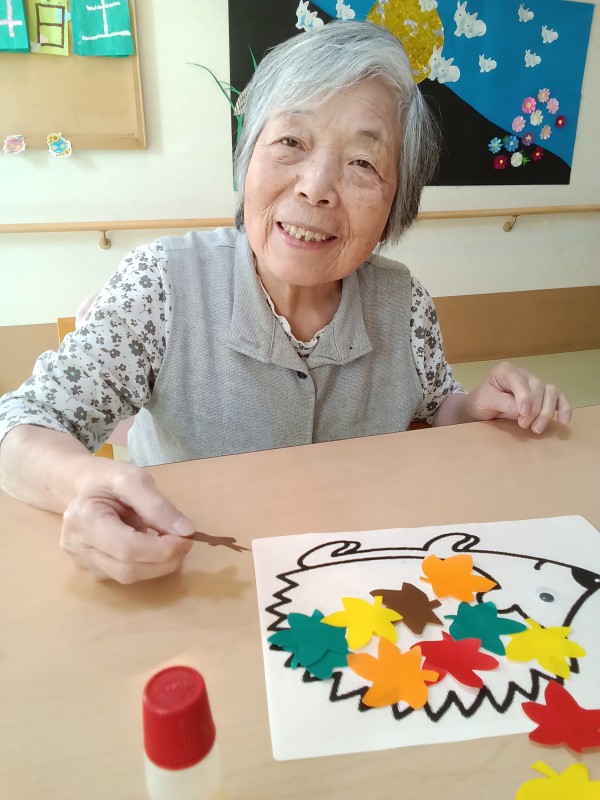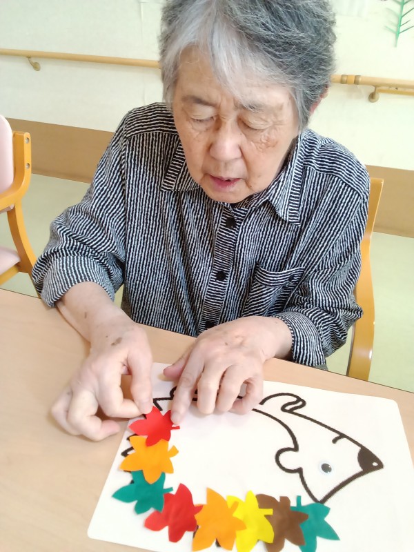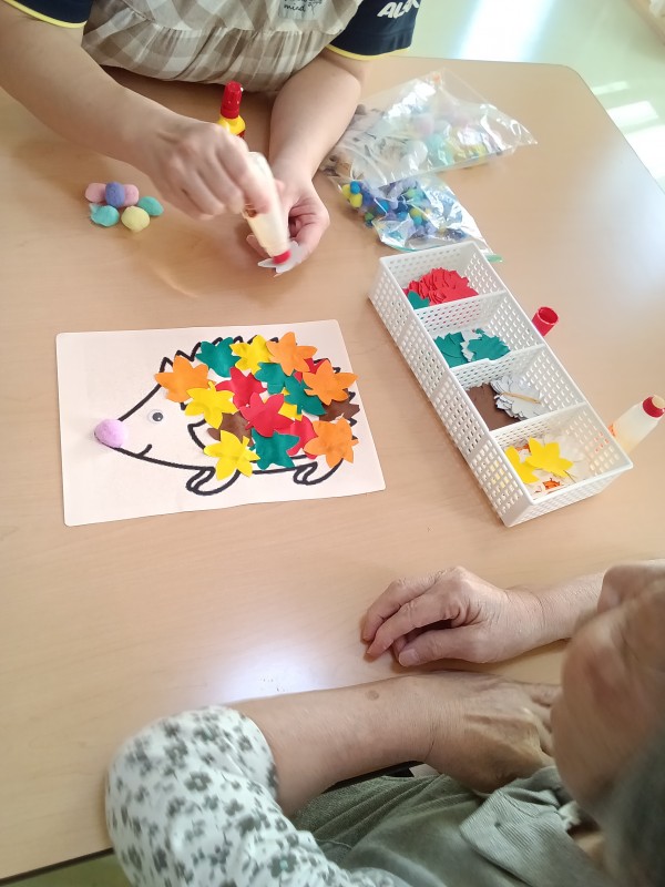 こうやって、ハリネズミの体に紅葉したもみじの葉っぱをね…
