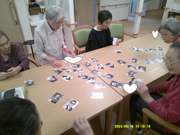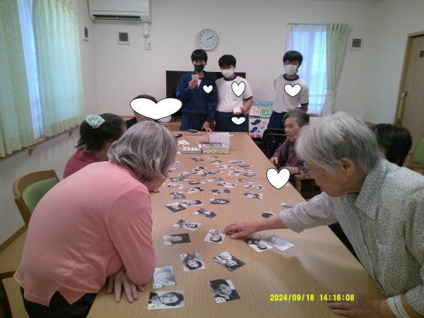 学生がカルタの読み札を呼んだものを入居者様皆様が会話しながら取り、