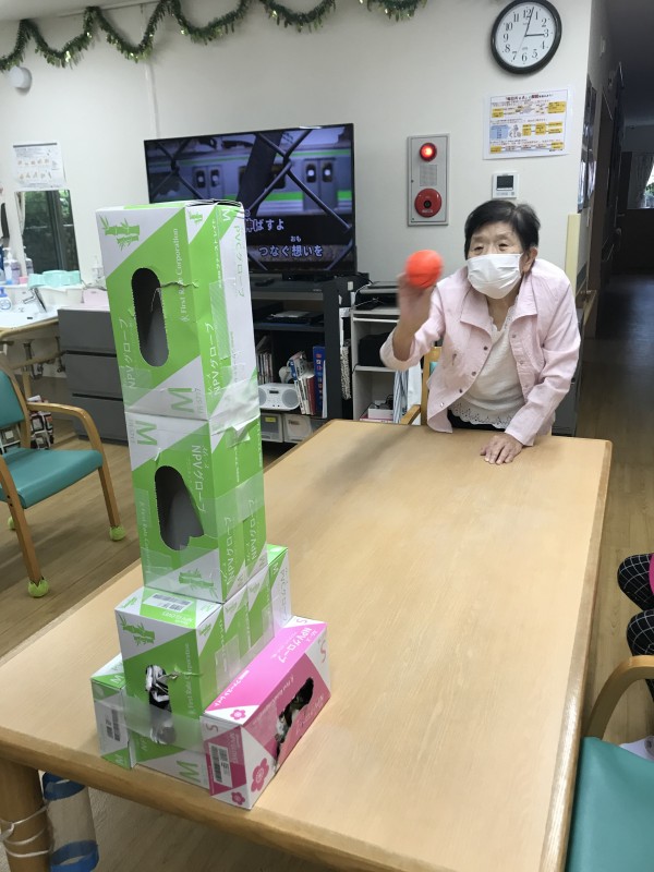 スタッフさんは、皆さんに楽しいことをしてもらいたいと思い、リサイクルでこんなタワーを作りました。