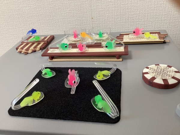 アイスの棒やプラスティックのスプーンを再利用して金魚さんを載せて飾られています。