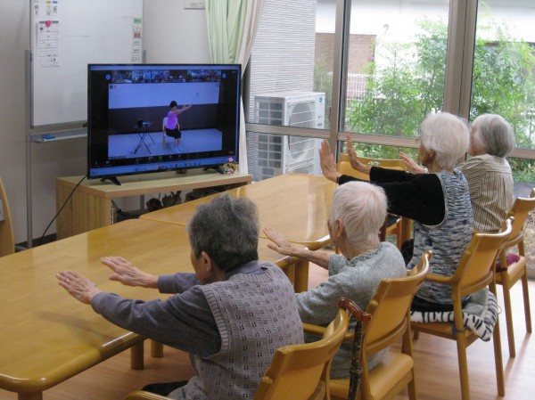 リモート体操(いきいきリズム体操)のご様子です( ^ω^)・・・ 手がしっかりと上に伸びていますね・・・(笑)