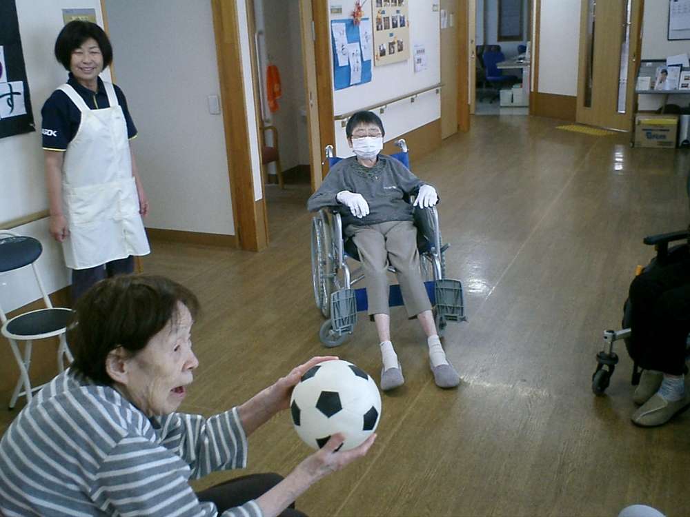 (※写真は、11時から行われているラジオ体操、上下肢体操やボール投げ等の様子です。)