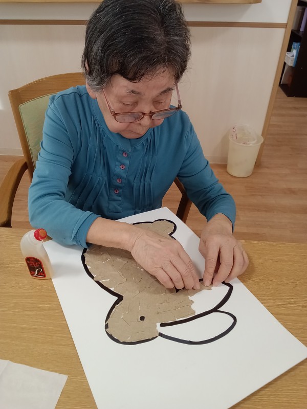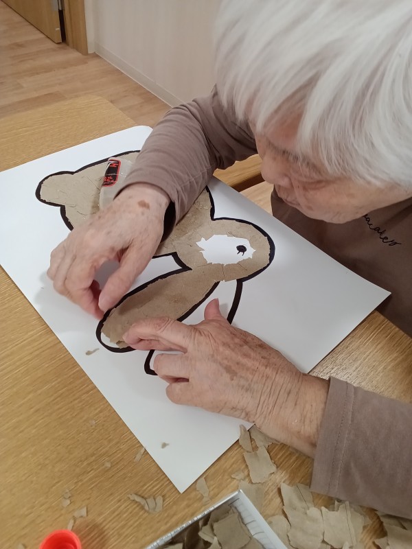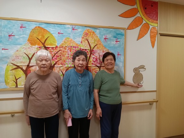 菊の花と、ちぎり絵のうさぎが出来上がり、色とりどりの紅葉を飾り完成しました〜♪