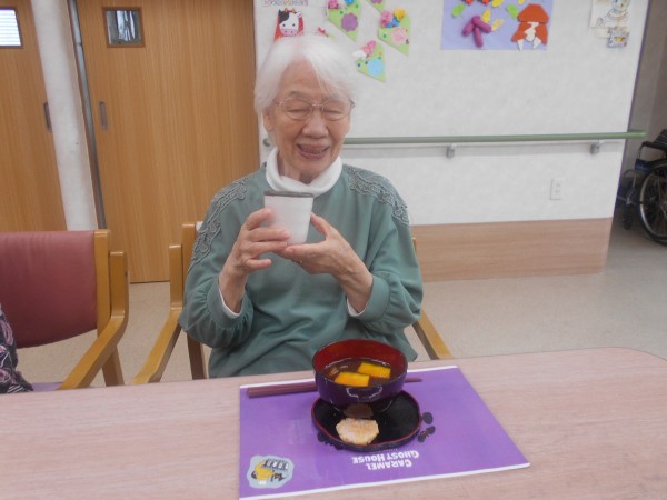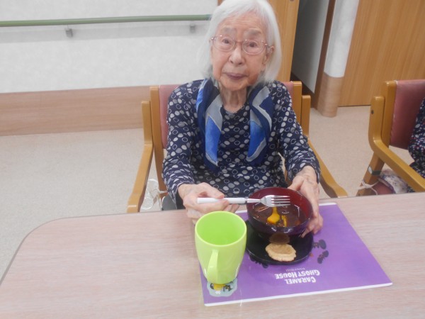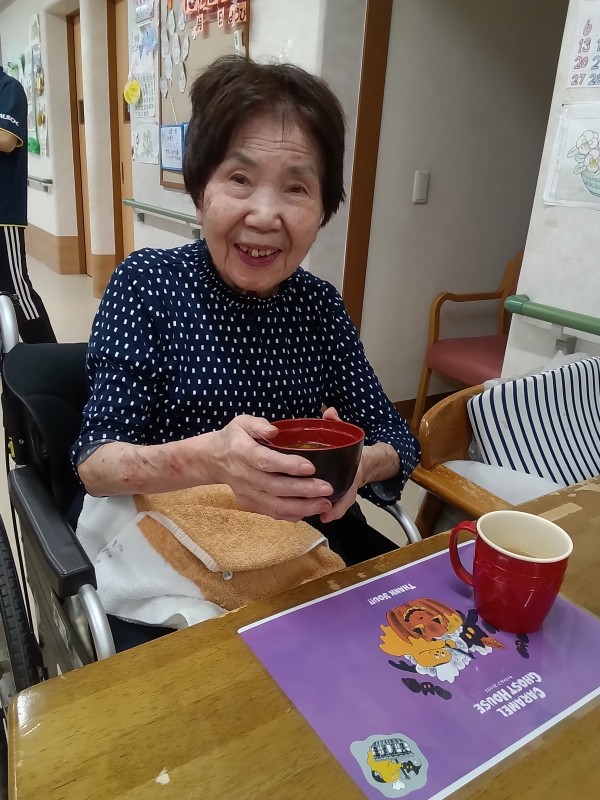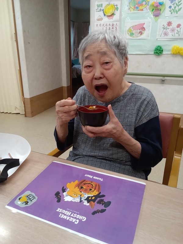 おやつは、皆さんが大好きなおしること、その中にハロウィンらしくかぼちゃを入れました(^^)/