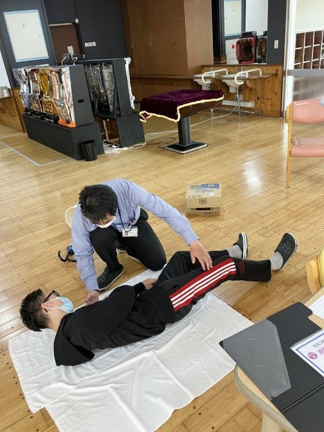 まず、最初に「火災・災害発生時の高齢者の避難対応」の競技の練習をしている様子の写真です。今回の競技は、地震が発生して避難しようとしたもののベットの横で転倒してしまい自力で避難することが難しく、ALSOKを呼んで一緒に安全に避難誘導をするという競技です。