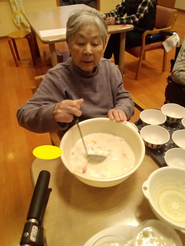 本日はおやつはフルーツ缶を使ったフルーチェです。