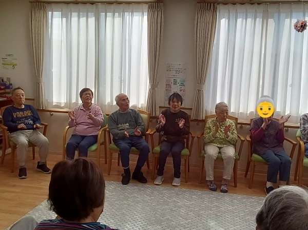 職員の「秋と言えば!」の声掛けに、食欲、スポーツ、秋刀魚、紅葉、焼き芋、柿等利用者様から沢山の言葉が次々とあがりました♪まずは紅葉にちなんだ体操からスタートです\(^o^)/