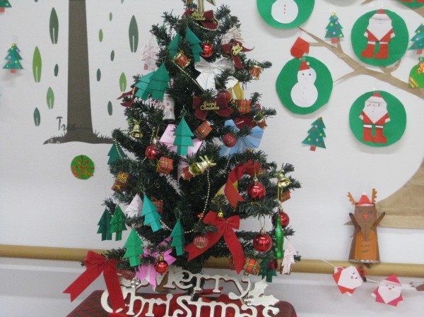 クリスマスツリーに飾り付けを行いました( ^ω^)・・・ プレゼント????・スズ・リボン????・☆等の飾り付けを行いました(^^)v