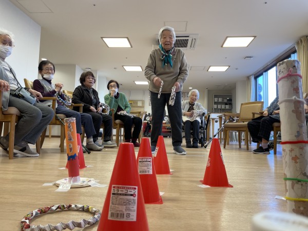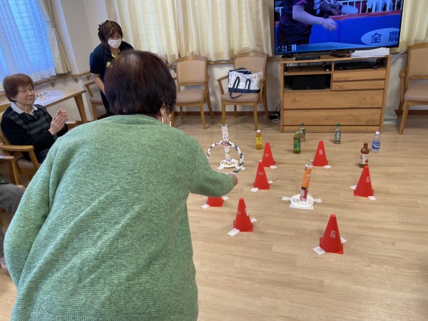 ボウリングと同じく手作りでの輪投げ大会を開催しました。