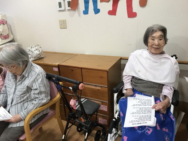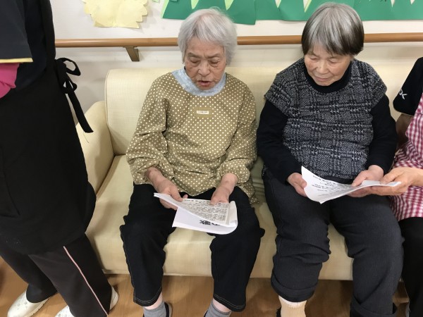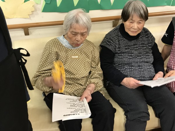 節分の日、鬼退治の後に歌会を行いました♪歌の本をお渡しして、季節の唱歌や童謡をたくさん皆さんで歌いました♪タンバリンも用意してとても盛り上がりましたね♪