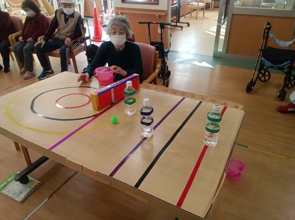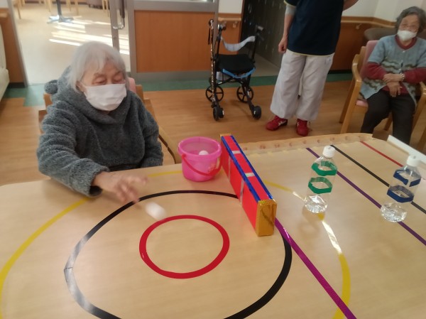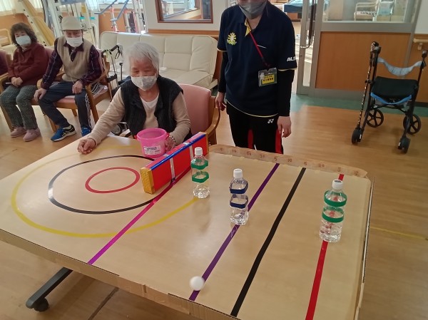 ピンポン玉を転がして、点数のついたカップの中に入れるゲームです。