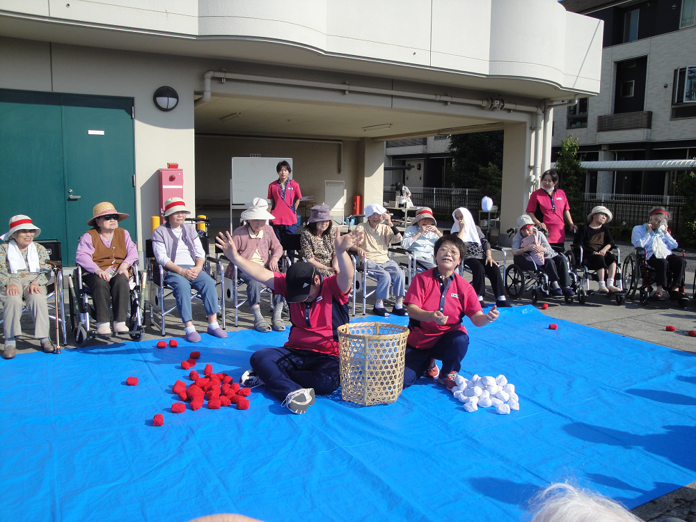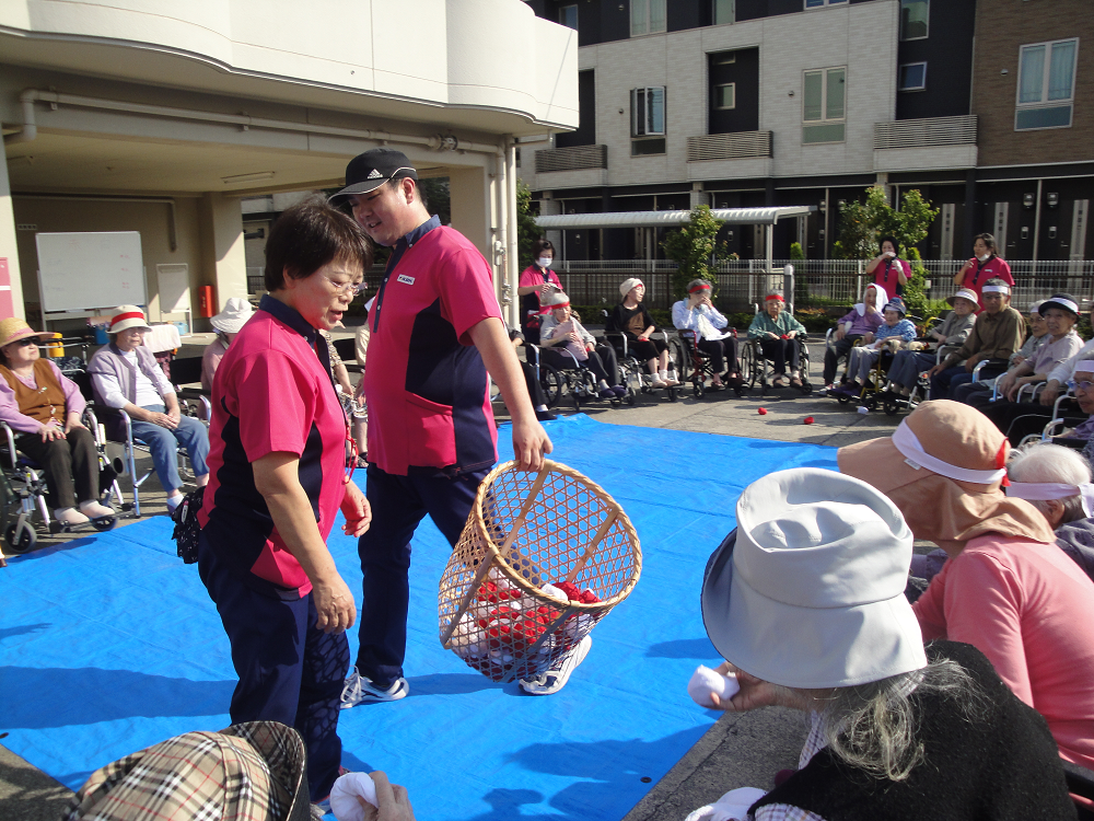 「玉入れ競技」かごの中には沢山玉が入りました。