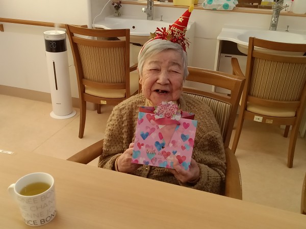 2月生まれのご利用者様4名(83歳・86歳・90歳・94歳)が、みんなでお誕生日の歌を歌い、誕生日プレゼントを受け取られると満面の笑みを浮かべらる方、少し涙腺が緩む方など、感無量の表情をされホールに集まったご利用者様から祝福を受けられていました。