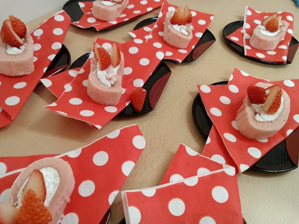ささやかながら、季節感ある職員お手製のロールケーキ(イチゴ乗せ)を召し上がっていただきました。