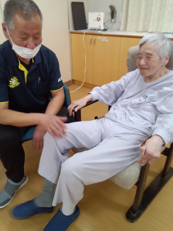 職員が「こっちの足を1,2,3,4...」と10回ずつ上げたり下げたりするためのお声がけをします。