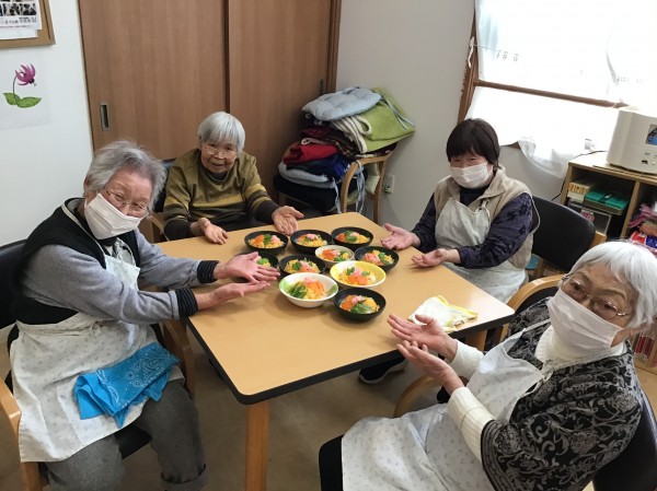 ちらし寿司を作っていただいています。ご飯と具をしっかり混ぜていただいたら、盛り付けをしていただきます。